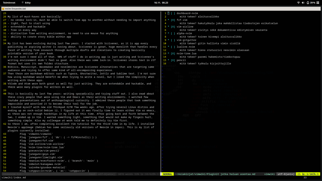 Rest of the plugins are nice-to-haves. I have not used them much yet. Fzf is ”fyzzy finder”. I don’t know what that means, but I read it can be useful. nvim-tree shows tree view of your folders. Goyo, limelight and vim-pencil are designed for writers. Basically writing modes (goyo and vim-pencil) and focus mode (limelight). Airline is better status bar. Rest are just color themes.